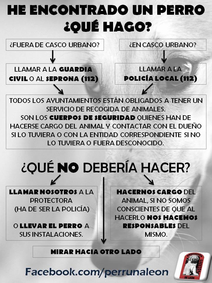 Si el animal es dócil, lo mejor es que nos hagamos cargo de él y lo llevemos personalmente al Albergue, las dependencias de la Policía Municipal o un centro veterinario, para comprobar si el animal tiene chip de forma que se pueda avisar a sus propietarios.